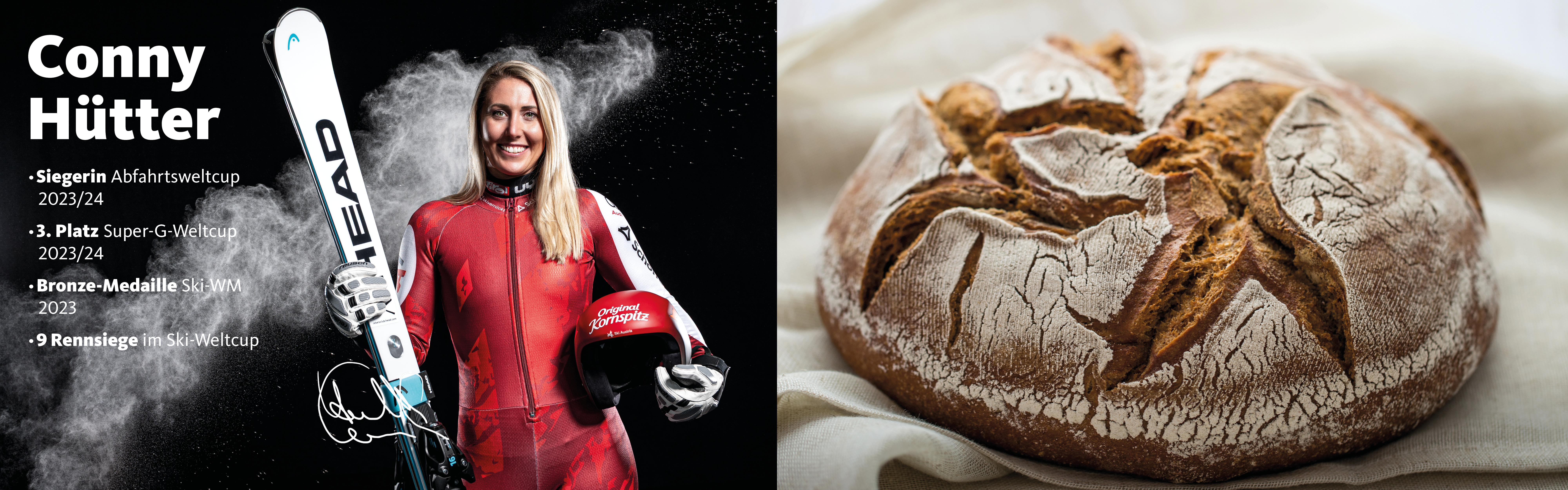 FĂŒr Conny HĂŒtter ist deswegen das neue Alpinbrot die ideale Grundlage, vereint es doch Dinkel und Roggen und liefert Energie fĂŒr Höchstleistungen, im Sport wie im Alltag.