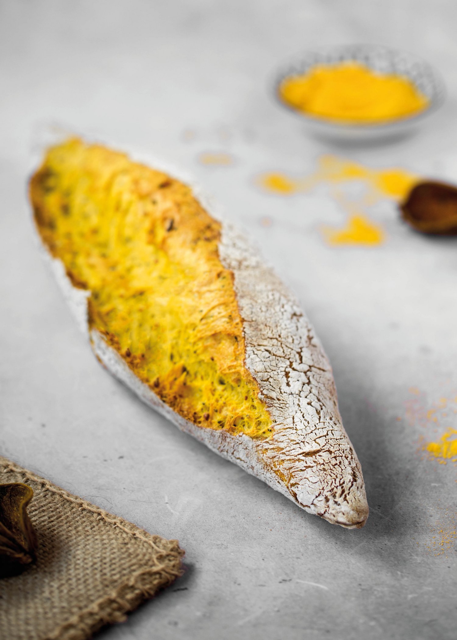 I mastri fornai backaldrin hanno creato svariate ricette con la nuova KurkumaMix. Nella Kurkuma Spitzbaguette il dosaggio della KurkumaMix, proprio come nelle altre ricette, è del 5% rispetto alla farina. Nella Kurkuma Baguette con Sabia la gialla spezia incontra l’eccezionale combinazione di fiocchi e semi di basilico, camelina, lino e chia, nonché fiocchi di patate e farina di mais. Le svariate possibilità d’impiego con la nuova KurkumaMix spianano la strada per la creatività . Si può così preparare l’impasto per i più svariati tipi di pane e panini gustosissimi, che catturano lo sguardo con il loro colore giallo brillante.